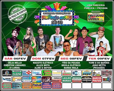 Em virtude dos problemas da estiagem e o estado de calamidade em que os municípios se encontram, o carnaval será realizado por parceiros públicos privados com total apoio na parte estrutural, segurança e limpeza da prefeitura de Frutuoso Gomes/RN.