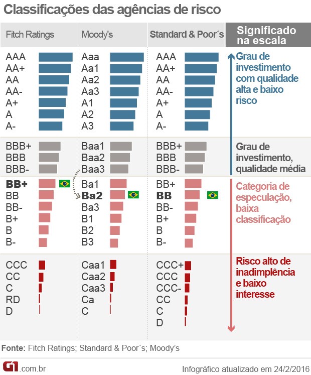 Último a a tirar grau de investimento Entre as três grandes agência internacionais, apenas a Moody’s mantinha o Brasil com grau de investimento. No dia 9 de dezembro, entretanto, a agência colocou a nota do país em revisão para possível rebaixamento, indicando que ela poderia ser reduzida em breve. A primeira a tirar o selo de bom pagador do Brasil foi a Standard and Poor’s (S&P), em setembro do ano passado. Há uma semana, a agência voltou a rebaixar a nota brasileira. Em dezembro, foi a vez da Fitch, que ao mesmo tempo colocou a nota do país em perspectiva negativa, indicando que ela pode voltar a ser rebaixada. (G1)
