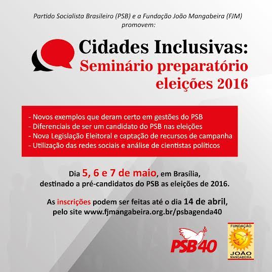 O Partido Socialista Brasileiro (PSB) e a Fundação João Mangabeira (FJM) vão promover o evento “Cidades Inclusivas: Seminário preparatório eleições 2016”, no dia 5, 6 e 7 de maio, em Brasília. O evento é destinado, principalmente, aos pessebistas que pretendem disputar o cargo de prefeito neste ano.