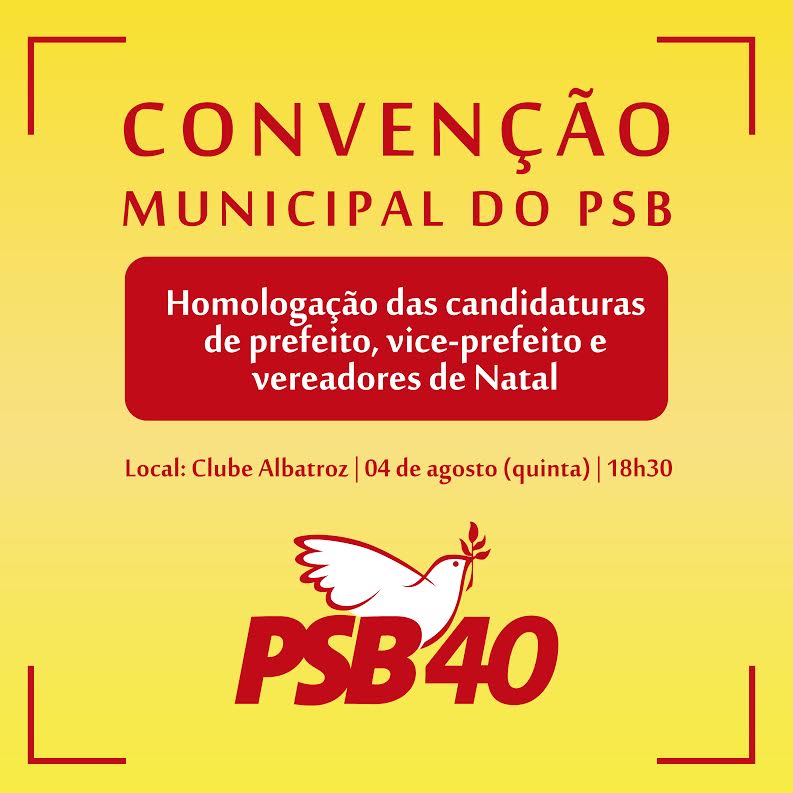 O Partido Socialista Brasileiro (PSB) Natal oficializou a data da sua convenção para o dia 4 de agosto, às 18h30, no Clube Albatroz. O evento tem como objetivo homologar a candidatura própria a Prefeitura de Natal, lançando o nome do deputado federal Rafael Motta, além dos nomes que vão concorrer a Câmara Municipal da Capital.
