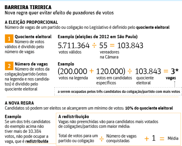 Os aspirantes a vereador que pegam carona com os candidatos “puxadores de voto” terão, pela primeira vez, uma meta a cumprir: para chegar à Câmara municipal, seu resultado nas urnas precisa ser, no mínimo, 10% do quociente eleitoral.