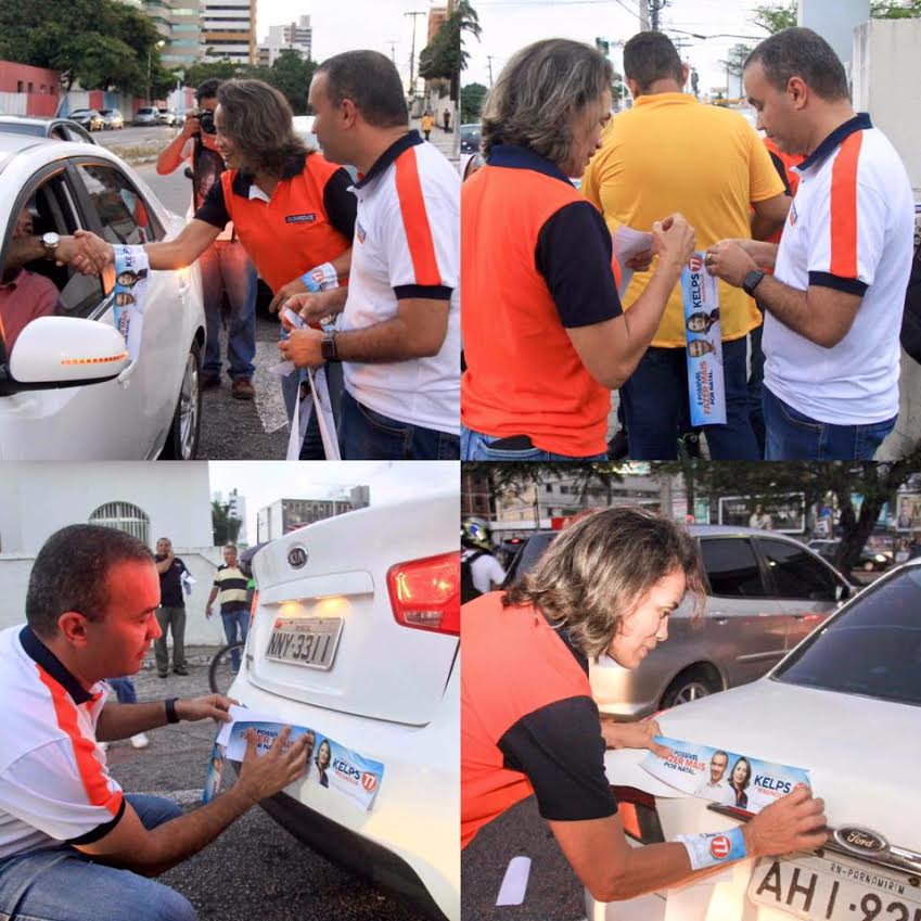 O candidato a prefeito Kelps Lima e a candidata a vice, Magnólia Figueiredo, adesivaram carros hoje à tarde no semáforo da avenida Salgado Filho, em frente ao Portugal Center.