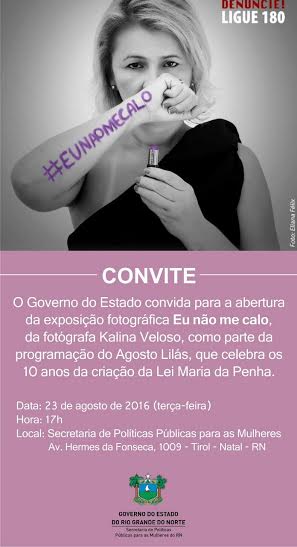 A secretaria estadual de Políticas Públicas para as Mulheres (SPM) realiza no próximo dia 23 de agosto, às 17h, o lançamento da exposição “Eu não me calo”, assinada pela fotógrafa Kalina Veloso. As fotos ficarão expostas na sede da SPM, localizada na Avenida Hermes das Fonseca, 1009, Tirol, Natal, no horário das 8h às 17h, até o dia 25 deste mês. O evento faz parte da programação do Agosto Lilás que celebra 10 anos da sanção da Lei 11.340/06, mais conhecida como Lei Maria da Penha.