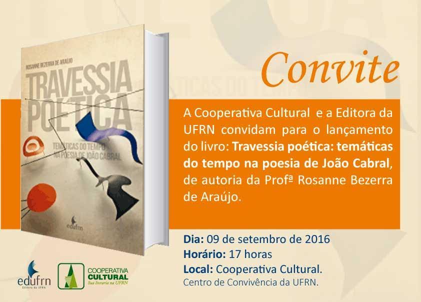 E à tarde, a partir das 17h, a temática do tempo na poesia de João Cabral de Melo Neto será o foco do lançamento do livro, A Cooperativa Cultural e a Editora da UFRN têm o prazer de convidá-lo para o lançamento do livro “Travessia poética: temáticas do tempo na poesia de João Cabral”, da autora Rosanne Bezerra de Araújo. A obra busca apreender o ser do tempo e seus desdobramentos no espaço do poema. O estudo oferece um novo olhar focado no processo criativo do poeta, ao percorrer o trajeto de sua poesia através da temática do tempo. Rosanne Bezerra é doutora, na Área de Concentração em Literatura e Cultura) pela Universidade Federal da Paraíba, com estágio de doutorado no exterior na Universidade de Nottingham, Inglaterra.