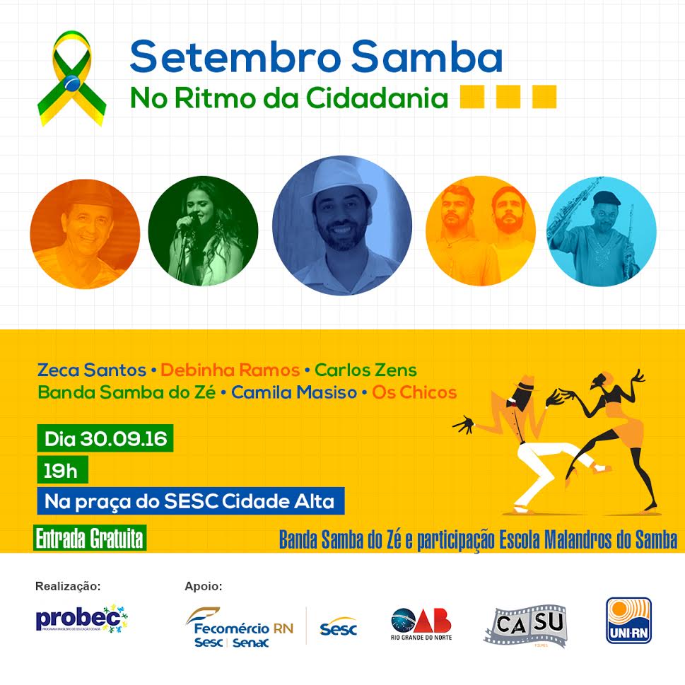 “Setembro samba no ritmo da cidadania” é o nome do evento de encerramento do mês que desperta a importância da Cidadania no RN. O Samba, que este ano celebra seu centenário e é considerado uma das principais manifestações culturais populares brasileiras, foi o gênero musical escolhido para a festa de encerramento do Setembro Cidadão. O evento acontece nesta sexta-feira (30), a partir das 19h, na Praça do Sesc da Cidade Alta, em Natal, e é totalmente gratuito.