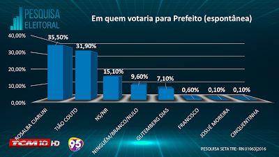 A TCM (TV Cabo Mossoró) acaba divulgar os números da pesquisa eleitoral feita pelo Instituto Seta. A pesquisa TCM/Seta traz a intenção de votos dos eleitores mossoroenses para prefeito e vereador. Foram realizadas 600 entrevistas nos dias 28 e 29 de setembro, com margem de erro de 3,5% e índice de confiabilidade de 95%, com registro RN-01063/2016, no Tribunal Superior Eleitoral.