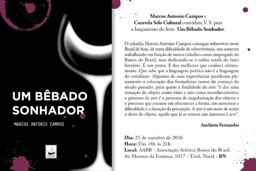 Imagine um bancário que, ao conversar com um dos clientes do banco consegue extrair um mote para fazer um poema. Até mesmo as figuras mais tresloucadas e inusitadas do bairro do Alecrim, onde morou parte de sua vida, se transformam em personagens líricos para sua poesia. Marcos Antônio Campos, leitor desde sempre, gostava de rabiscar uma coisa ou outra no papel, mas não se levava a sério como poeta. Até que instituições culturais começaram a premiá-lo por poesias que enviava. O primeiro livro “Um Bêbado Sonhador” que será lançado nessa terça-feira, 25 de outubro, na AABB, na Hermes da Fonseca, a partir das 18h, levou cinco anos para ser concluído.