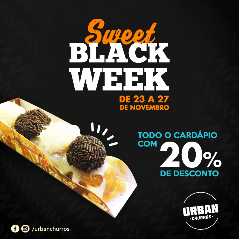 O Urban Churros também está no clima da Black Friday e lança a sua Sweet Black Week, uma semana inteirinha com 20% de desconto no cardápio que começa hoje e só termina no domingo, 27. A partir das 18 horas, o food kart vai estar na calçada da Quick Lube, Av. Augusto Severo – Centro.
