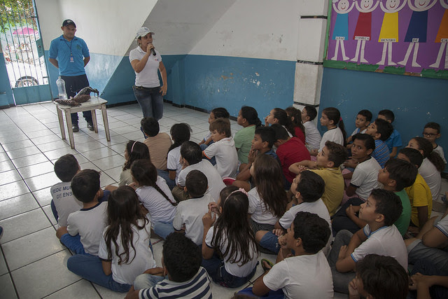 Agentes de endemias orientaram as crianças, na faixa etária de 6 a 12 anos de idade, a combater o mosquito transmissor de Dengue, Chikungunya e Zika vírus. “O objetivo é que vocês sejam fiscalizadores em suas casas e não permitam que recipientes acumulem água parada. É isso que favorece o nascimento da larva”, orientou José Paixão, coordenador de área. A diretora da escola, Dalvanir Marques, comemorou: “Gostei muito de receber os profissionais. Precisamos orientar, desde criança a adultos, a combater o mosquito, e a escola tem um papel fundamental nessa conscientização”, declarou.