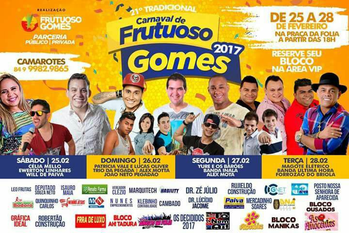 Em virtude dos problemas da estiagem e o estado de calamidade em que os municípios se encontram, o carnaval será realizado por parceiros públicos privados com total apoio na parte estrutural, segurança e limpeza da prefeitura de Frutuoso Gomes/RN.