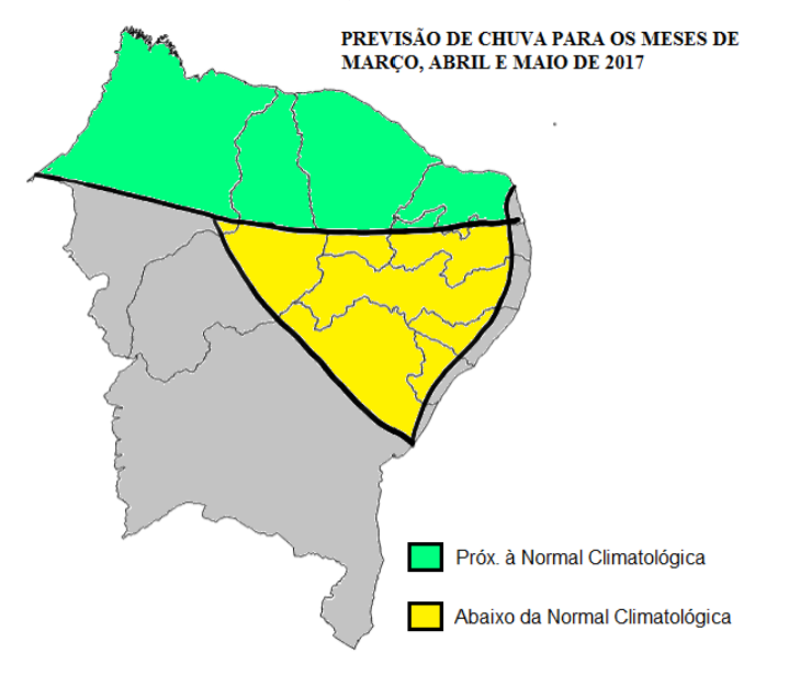 Os meteorologistas utilizaram uma imagem com base no mapa do Nordeste, sinalizando de cor verde a área que terá chuvas, a cor amarela para chuvas abaixo do normal e a cor cinza para definir a área de baixa visibilidade. A previsão é para a quadra chuvosa de março a maio. A elaboração do documento contou com a participação dos meteorologistas de instituições estaduais, além do INPE/INMET e Ministério da Agricultura, Pecuária e Abastecimento (MAPA).