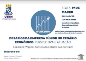 O Centro Acadêmico do curso de Economia da Universidade do Estado do Rio Grande do Norte – Campus de Assú – e a Empresa Júnior de Economia do Vale do Açu (ECONVALE) promovem o Workshop “Desafios da Empresa Júnior no cenário econômico: perspectiva e atuação”. O evento acontece no dia 17 de março de 2017, das 14h às 18h.