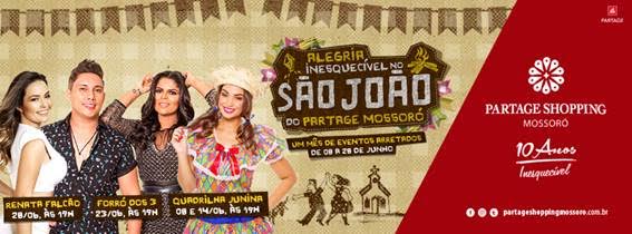 O Partage Shopping Mossoró realiza, por mais um ano, a tradicional festa junina, que neste ano traz para a população local diversas atrações artísticas e shows especiais. O empreendimento busca proporcionar ao público entretenimento de qualidade com conforto e, principalmente, segurança a todos os clientes.