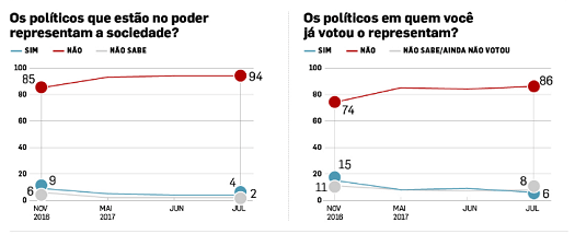 Para 94%, os políticos que estão no poder não representam a sociedade. Apenas 4% acham o contrário. Quem está na oposição também é alvo de desconfiança. Quando a pergunta é sobre os políticos em quem os entrevistados já votaram em algum momento, 86% dizem não se sentir representados.