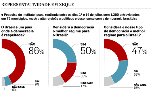 Desde novembro do ano passado houve queda de nove pontos porcentuais na taxa dos que se consideram representados. A onda de negativismo contamina a percepção sobre a própria democracia: só metade da população considera que esse é o melhor regime para o Brasil, e um terço afirma que não é. Quando os eleitores são questionados especificamente sobre o modelo brasileiro de democracia, a taxa de apoio é ainda mais baixa: 38% consideram que é o melhor regime, e 47% discordam. A pesquisa também mostra que 74% são contra o voto obrigatório.