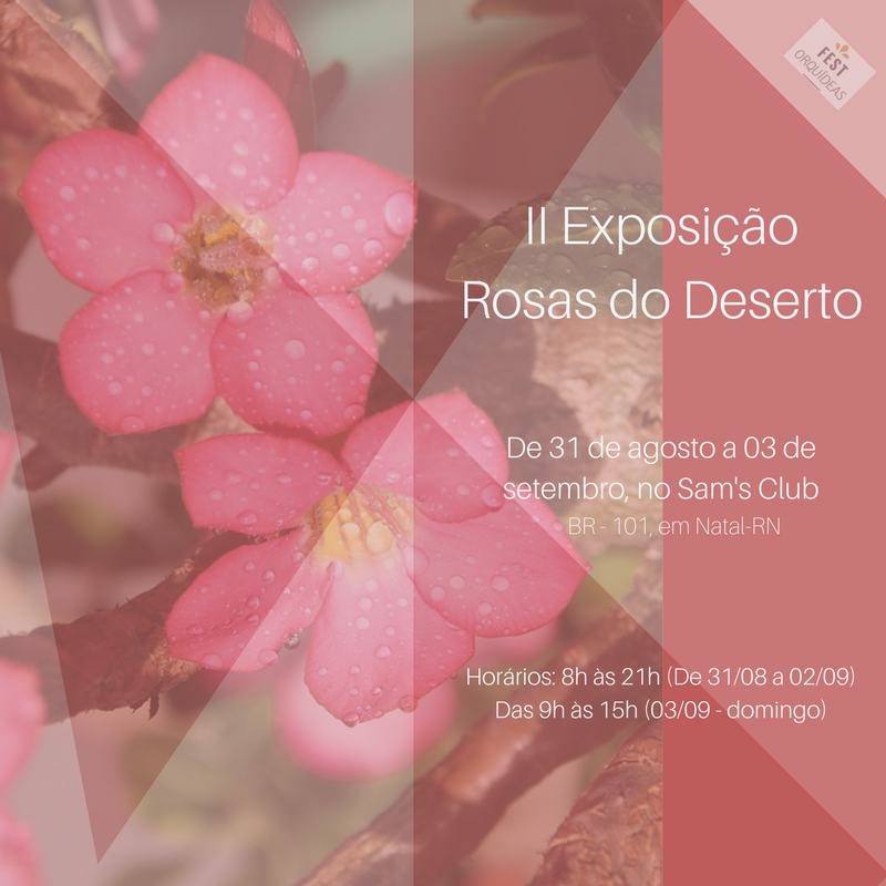 Natal vai sediar no período de 31 a 03 de setembro a II Exposição de Rosas do Deserto, no Sam’s Club – BR 101, em Neópolis, com entrada gratuita e comercialização de mudas. A flor é nativa de ambientes áridos do norte da África, do Oriente Médio e podem ser cultivadas em apartamentos ou casas.