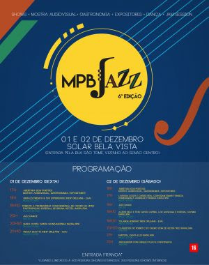 Com produção da Green Point Produções, Inspirado no French Quarter Festival (New Orleans), e mantendo a proposta de promover o intercâmbio entre artistas potiguares e norte-americanos atuantes na cidade de New Orleans, o MPB Jazz chega a 6ª edição. Antigo palacete residencial construído em 1907 e tombado pelo patrimônio histórico, cujo salão foi testemunha de grandes festas desde a Segunda Guerra Mundial (quando a cidade foi base militar norte-americana), o Solar Bela vista acolherá o 6º MPBJAZZ nos dias 01 e 02 de dezembro – não poderia haver espaço mais inspirador para esse intercâmbio musical que acontece desde 2010.