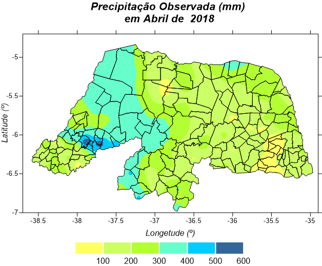 Na análise da chuva acumulada no ano de 2018, até o mês de abril, quando comparada como valor climatológico para o período de janeiro a abril, apresenta um desvio positivo climatológico de 33,5%, ou seja, choveu 33,5% acima da média esperada, conforme as previsões divulgadas pelo Núcleo de Meteorologia do Nordeste, em fevereiro deste ano.