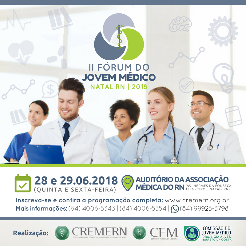 Abertas as inscrições para o II Fórum do Jovem Médico, que será realizado pelo Conselho Regional de Medicina do RN – CREMERN nos dias 28 e 29 de junho. O evento dará oportunidade para jovens profissionais e estudantes de medicina participar gratuitamente de debates com temas, como: Escolas Médicas; Gestão e Carreira; Saúde do Médico; Inovação e Publicidade Médica.