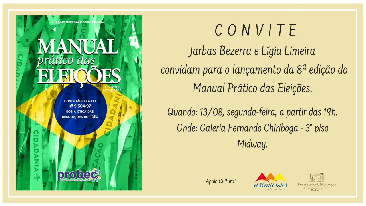 Para orientar e tirar as dúvidas da população quanto ao período eleitoral do país, o Programa Brasileiro de Educação Cidadã – PROBEC, idealizado pelo Juiz Jarbas Bezerra e a advogada Lígia Limeira, lança nesta segunda-feira (13), a 8ª edição do Manual Prático das Eleições. Aberto ao público, o evento acontece a partir das 19h, na Galeria Fernando Chiriboga, localizada no 3º piso do Midway Mall.