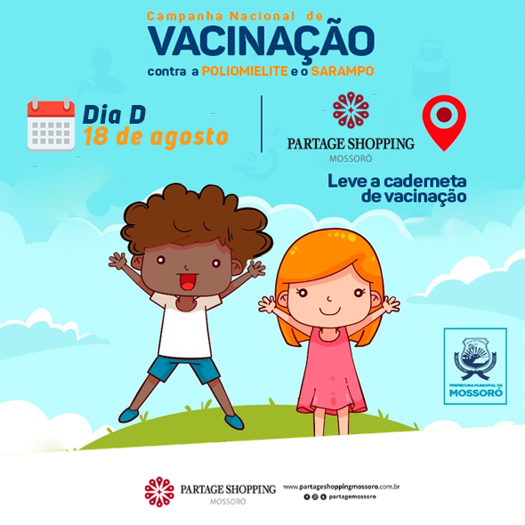 Neste sábado, 18 de agosto, acontece o Dia D de vacinação contra o sarampo e a poliomielite. O Partage Shopping Mossoró será ponto de vacinação. Poderão ser vacinadas crianças entre um ano e menores de cinco anos, mediante a apresentação da Caderneta de Vacinas. A ação será realizada a partir das 10h, próximo à Cacau Show, na primeira portaria do empreendimento. Vale ressaltar que a vacinação é gratuita e acontecerá até acabar o estoque.