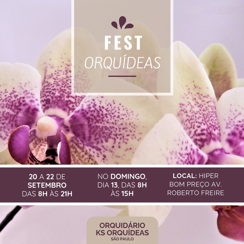Para encerrar o mês de setembro e florir outubro, o Fest Orquídeas realiza no Hiper Bompreço, de Capim Macio, dos dias 20 a 23 mais uma edição, com muitas novidades também do orquidário KS Orquídeas de São Paulo – SP.