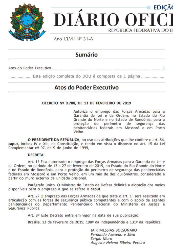 Presidente da República, Jair Bolsonaro, autorizou a partir desta quarta-feira(13) até o dia 27 o reforço da segurança no entorno do Presídio Federal, em Mossoró.