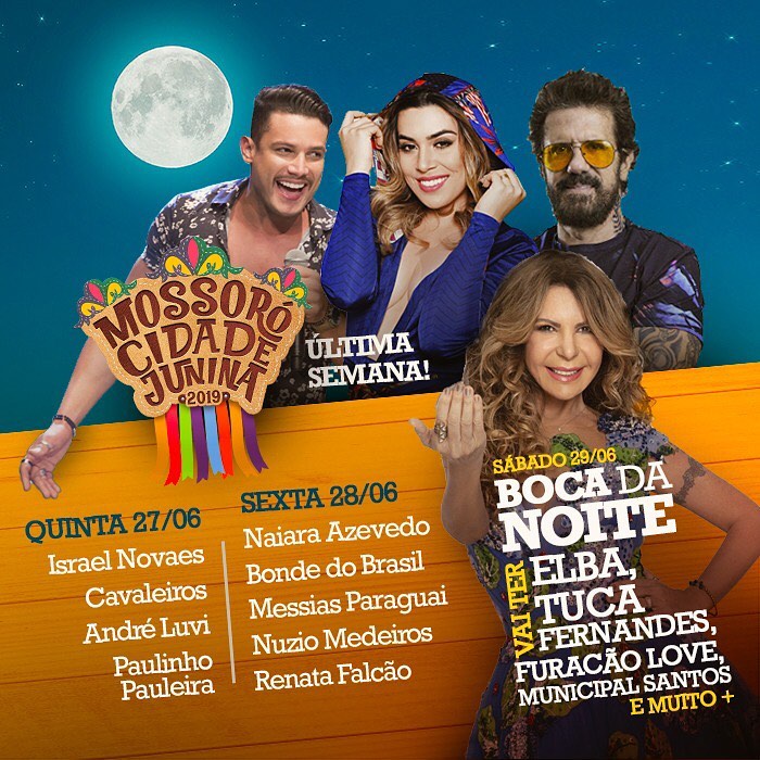 Para 2019, a programação do Boca da Noite terá início às 17 horas deste sábado (29). Três trios farão o mesmo percurso do Pingo Da Mei Dia e terão como atrações Elba Ramalho e Tuca Fernandes, além dos artistas locais: Banda Bakulejo, Forró Classe A, Municipal Santos, Thyalis Martins, Furacão Love e Caddu Rodrigues.