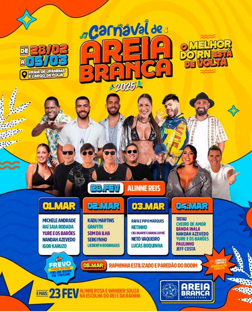 Os preparativos para o Carnaval de Areia Branca 2025 já estão em andamento, e a cidade se prepara para receber visitantes e locais em uma celebração que promete ser inesquecível, marcada pela música, alegria e diversidade. O evento contará com reforço na segurança pública para garantir que os foliões aproveitem todos os dias de festa com muita paz. O Carnaval de Areia Branca/RN 2025 é a promessa de uma semana intensa de celebração, unindo tradição, diversidade musical e muita animação. Prepare-se para viver momentos inesquecíveis nessa festa que já é aguardada ansiosamente por todos os amantes do Carnaval!