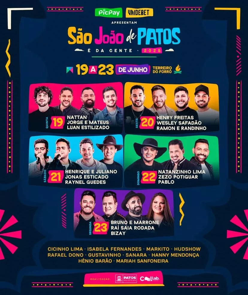 Com novidades entre as atrações, o “São João de Patos, É da Gente!” será realizado entre os dias 19 e 23 de junho e contará com atrações de peso no cenário nacional e nordestino. Entre os nomes anunciados, Pablo, Bruno e Marrone, Henrique & Juliano, Jorge & Mateus e Nathazinho Lima. E em todos os dias haverá atrações inseridos na grade de programação