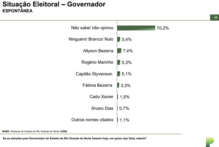 No cenário espontâneo, Allyson aparece com 7,4% e Rogério Marinho com 5,3%, ambos estão empatados dentro da margem de erro da pesquisa que é de 2,6 pontos percentuais, para mais ou para menos. Styvenson (5,1%), Fátima Bezerra (3,3%), Cadu Xavier (1,5%) e Álvaro Dias (0,7%) também foram citados.