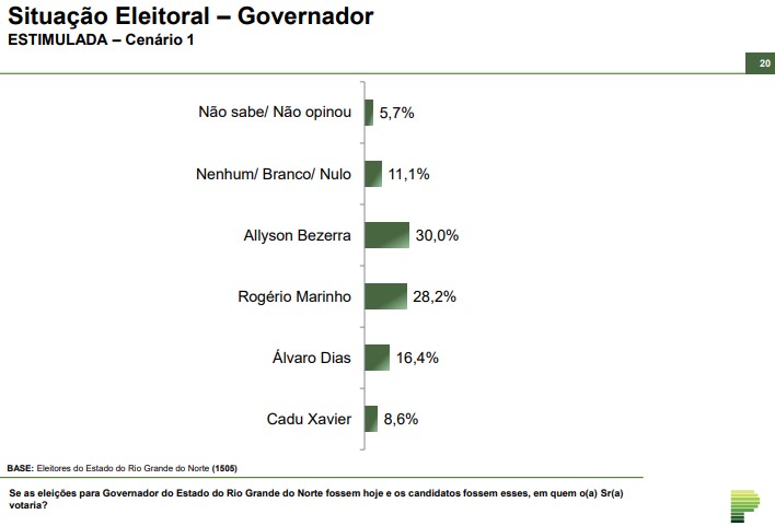 Já no cenário estimulado, Allyson foi citado por 30% dos entrevistados e 28,2% afirmaram que votariam em Rogério Marinho, em mais um empate técnico dentro da margem de erro de 2,6 pontos percentuais. Álvaro Dias foi citado por 16,4% e Cadu Xavier por 8,6%.