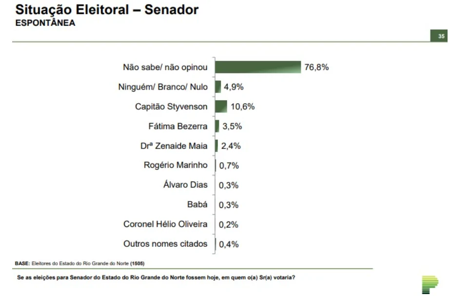 Pesquisa do Instituto Paraná Pesquisas divulgada na quinta-feira (11) mostra que no cenário espontâneo, Styvenson Valentim lidera as intenções de voto para o Senado no RN com 10,6%, seguido por Fátima Bezerra com 3,5% e Zenaide Maia com 2,4%.