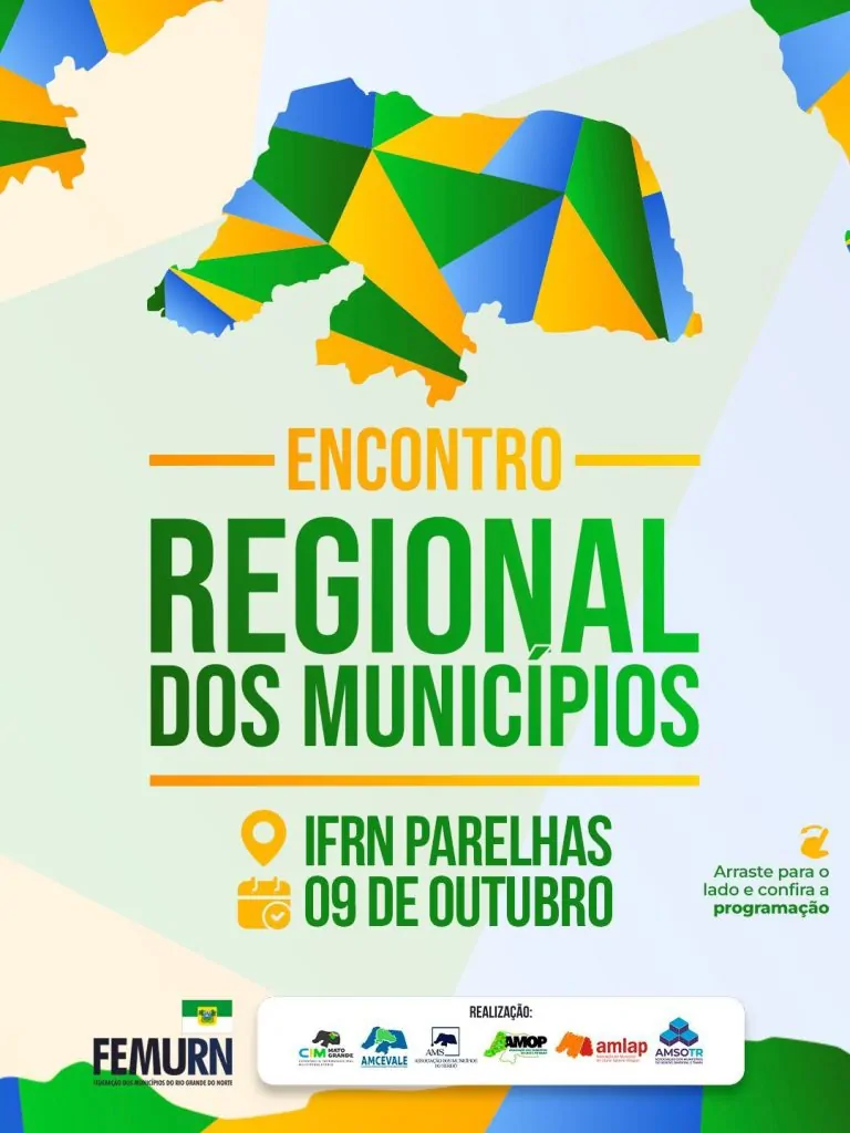 A Federação dos Municípios do Rio Grande do Norte (FEMURN) realiza nesta quinta-feira, 09 de outubro, no IFRN de Parelhas, o Encontro Regional dos Municípios – Região do Seridó. O evento, que tem como anfitrião o prefeito Dr. Tiago Almeida, reunirá gestores e parlamentares da região para discutir soluções em captação de recursos, saúde, integridade pública e atualidades legislativas.