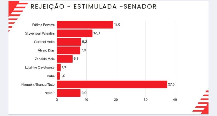 No voto estimulado, quando os nomes são apresentados, Zenaide Maia mantém a liderança no Voto 1, com 24,8%, seguida por Fátima Bezerra (22,0%) e Styvenson Valentim (18,0%). Já no Voto 2, o cenário muda: Zenaide continua na frente, com 17,6%, mas há maior dispersão dos votos, com Fátima (8,5%), Styvenson (8,2%), Álvaro Dias (4,5%) e Coronel Hélio (4,1%). Os índices de branco/nulo (23,3%) e NS/NR (31,8%) seguem elevados, reforçando a ideia de indefinição sobre a segunda escolha.