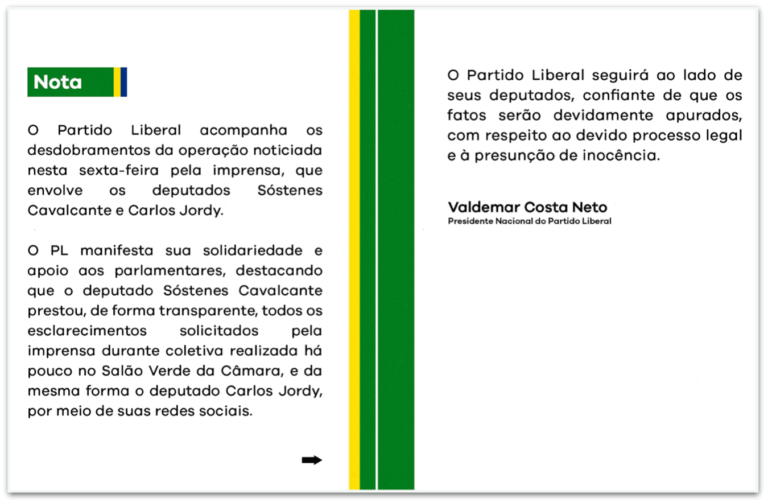 “O Partido Liberal seguirá ao lado de seus deputados, confiante de que seus fatos serão devidamente apurados, com respeito ao devido processo legal e à presunção de inocência”, finaliza a nota.