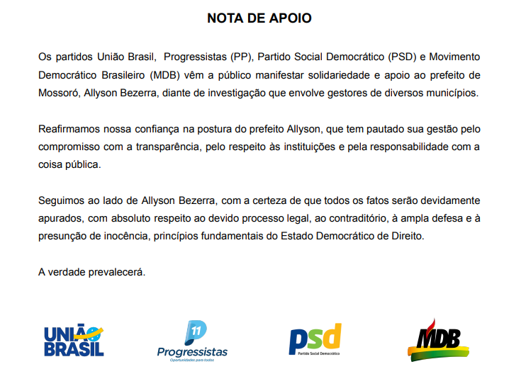 Os partidos União Brasil, Progressistas (PP), Partido Social Democrático (PSD) e Movimento Democrático Brasileiro (MDB) vêm a público manifestar solidariedade e apoio ao prefeito de Mossoró, Allyson Bezerra, diante de investigação que envolve gestores de diversos municípios.
